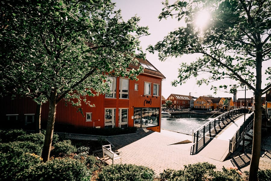 Vi ligger på solsiden på Fiskebrygga i Kristiansand og har en unik restaurant med originalt interiør og kunst av Kjell Nupen.