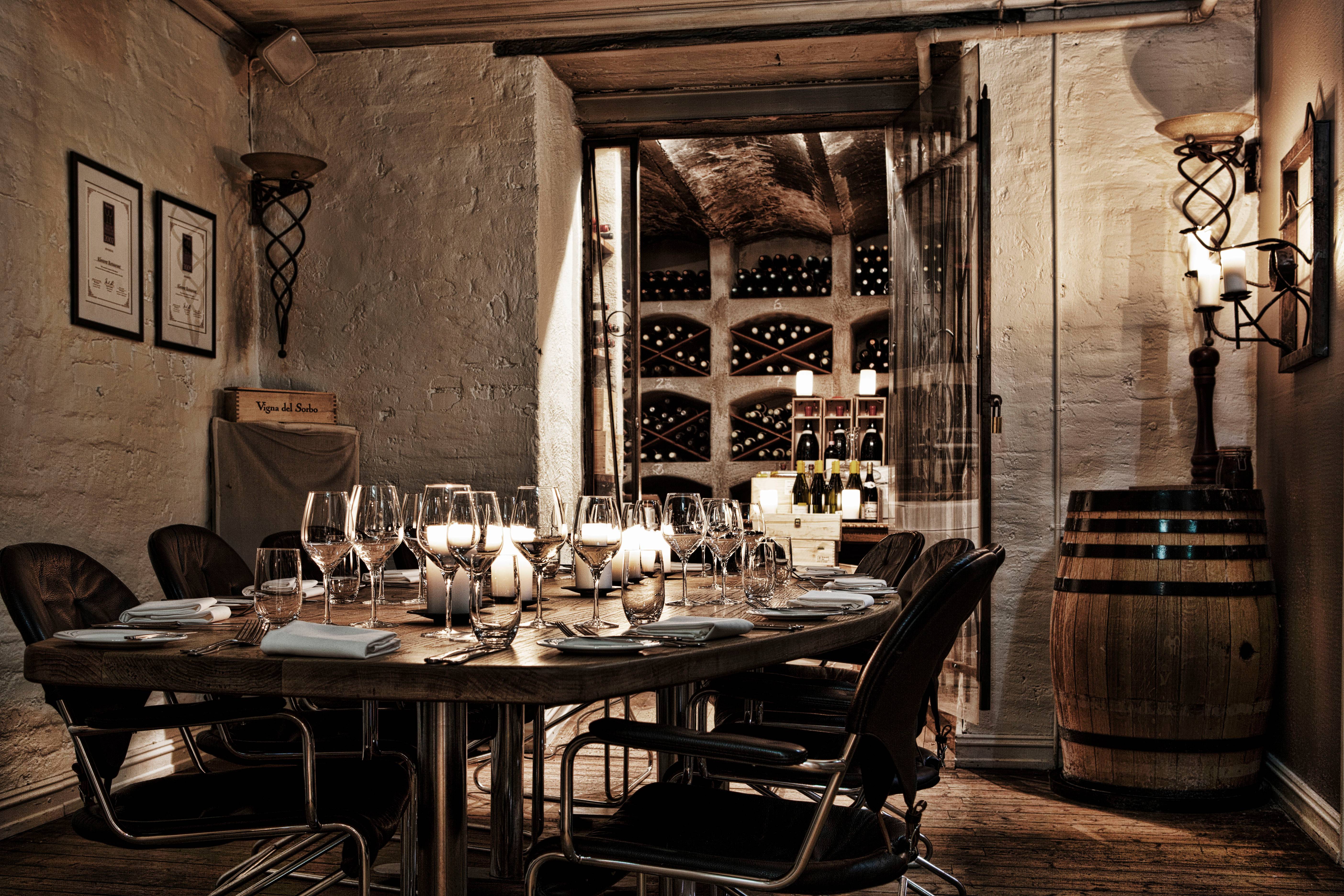 Velkommen til vår restaurant. Kom inn den massive tredøren og ned i den stemningsfulle kjelleren. Der blir du møtt av et hav med levende lys, buede teglverkstein, og lyden av dempet gregoriansk musikk.